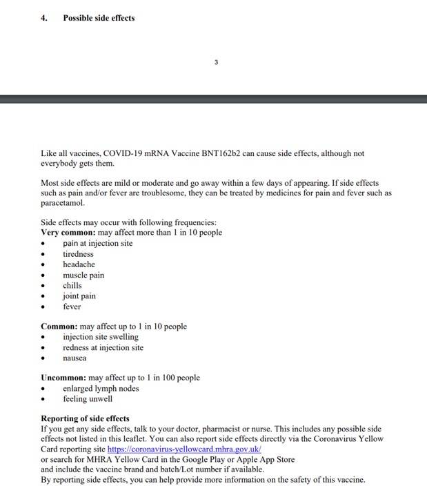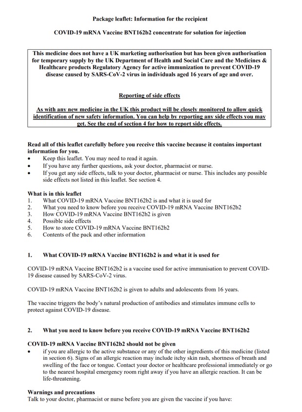 Guvernul din Marea Britanie a publicat pe site-ul instituției prospectul pentru vaccinul anti-Covid 19 dezvoltat de Pfizer în colaborare cu compania germană BioNTech. Acesta conține informații despre compoziția vaccinului, contraindicații și posibile efecte adverse.