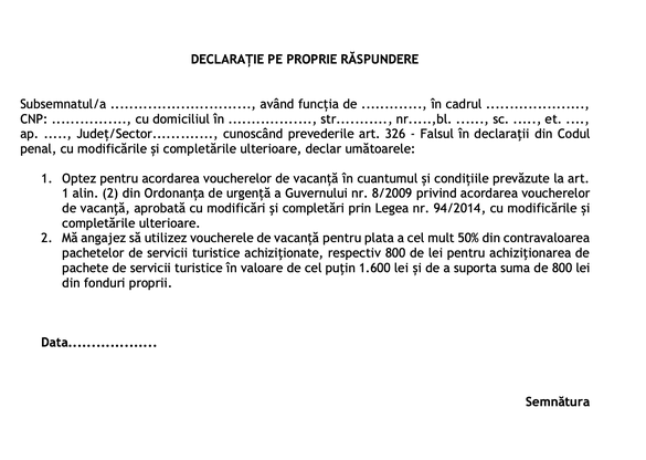 Salariații din instituțiile publice care vor beneficia de vouchere de vacanţă în valoare de 800 de lei vor trebui să semneze un angajament pe proprie răspundere. Prin această declarație, aceștia își asumă că vor folosi voucherul pentru plata a cel mult 50% din contravaloarea unui pachet turistic de minimum 1.600 de lei și că vor achita din surse proprii diferența de 800 lei.
